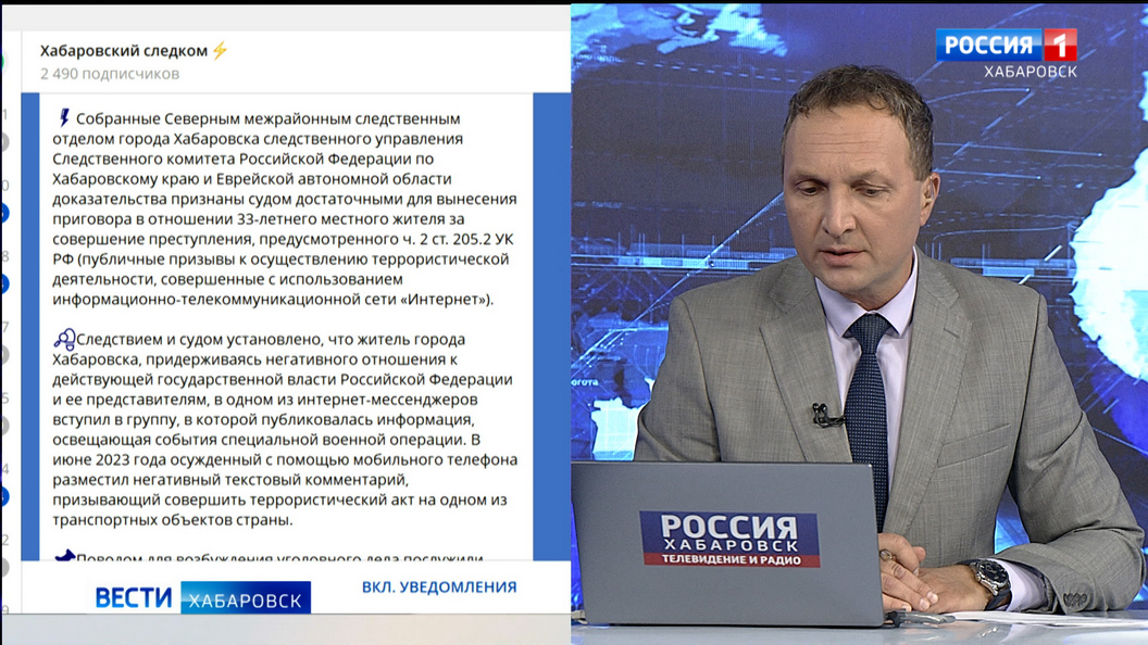 Вынесен обвинительный приговор хабаровчанину за публичные призывы к осуществлению террористической деятельности. Об этом сегодня сообщает телеграм-канал краевого следственного комитета.