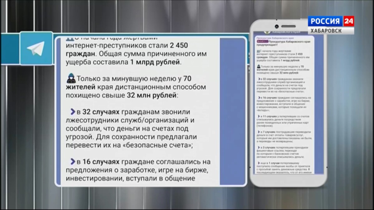 Об этом сообщает телеграм-канал краевой прокуратуры. Жертвами уловок злоумышленников стали 2 450 человек – только за минувшую неделю 70 пострадавших. Дистанционным способом похищено свыше 32 миллионов.