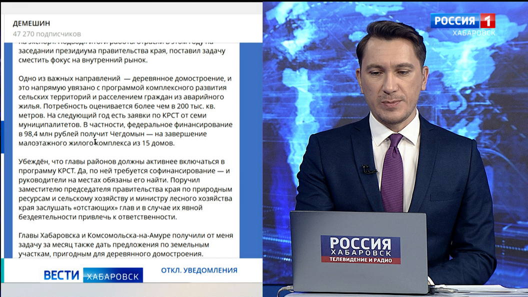 Сейчас 95 процентов продукции идёт на экспорт. Как заявил губернатор Хабаровского края сегодня в своём телеграм-канале, одно из важных направлений – деревянное домостроение, и это напрямую увязано с программой комплексного развития сельских территорий и расселением граждан из аварийного жилья.