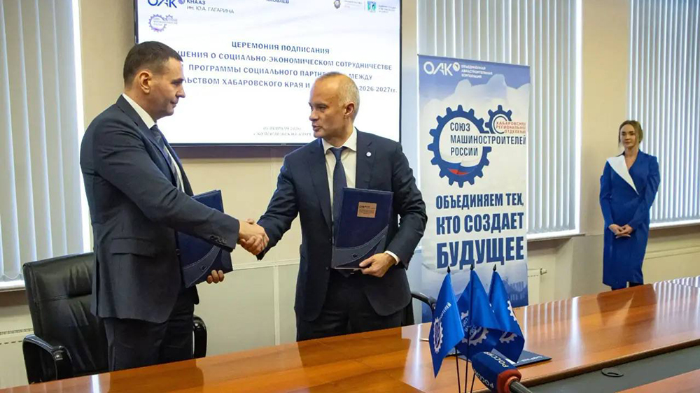 Губернатор Дмитрий Демешин и генеральный директор ОАК Вадим Бадеха подписали соглашение о социально-экономическом сотрудничестве между правительством Хабаровского края и ПАО «Объединённая авиастроительная корпорация» (входит в Госкорпорацию Ростех) и программу социального партнёрства на 2026-2027 годы. Встреча прошла на территории филиала ПАО «ОАК» Комсомольского-на-Амуре авиационного завода им. Ю.А. Гагарина.