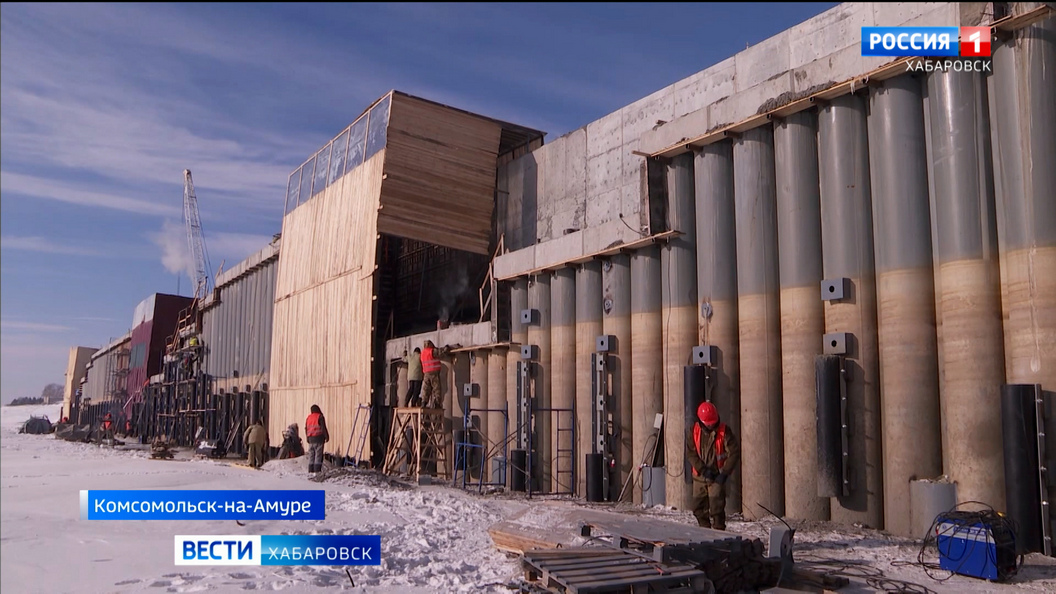 Мороз за минус 20, но именно зимние холода дали возможность подрядчику, который реконструирует пассажирский причал в Комсомольске-на-Амуре, работать на нижнем уровне пристани. Леса стоят на льду, который сковал реку до весны.