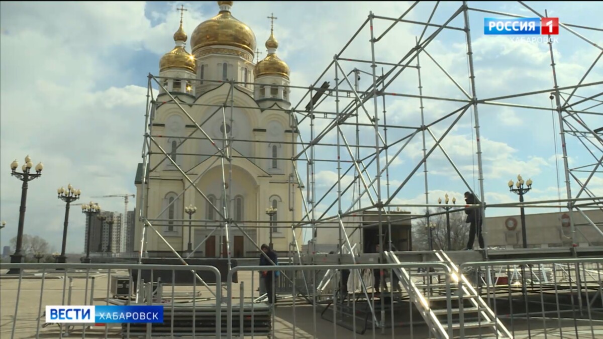 Здесь возле главного собора города 12 апреля состоится масштабный Пасхальный фестиваль. Как мы видим на площади уже начались приготовления. Важной частью праздника станет ярмарка «Сделано в Хабаровском крае», где местные производители представят свою продукцию.